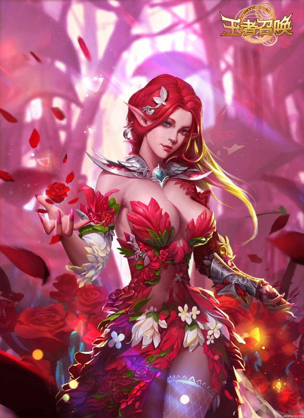 red hair and is adorned with floral motifs, suggesting she might have some connection to nature or magic. Her attire includes elements that could imply she is an elf or a similar