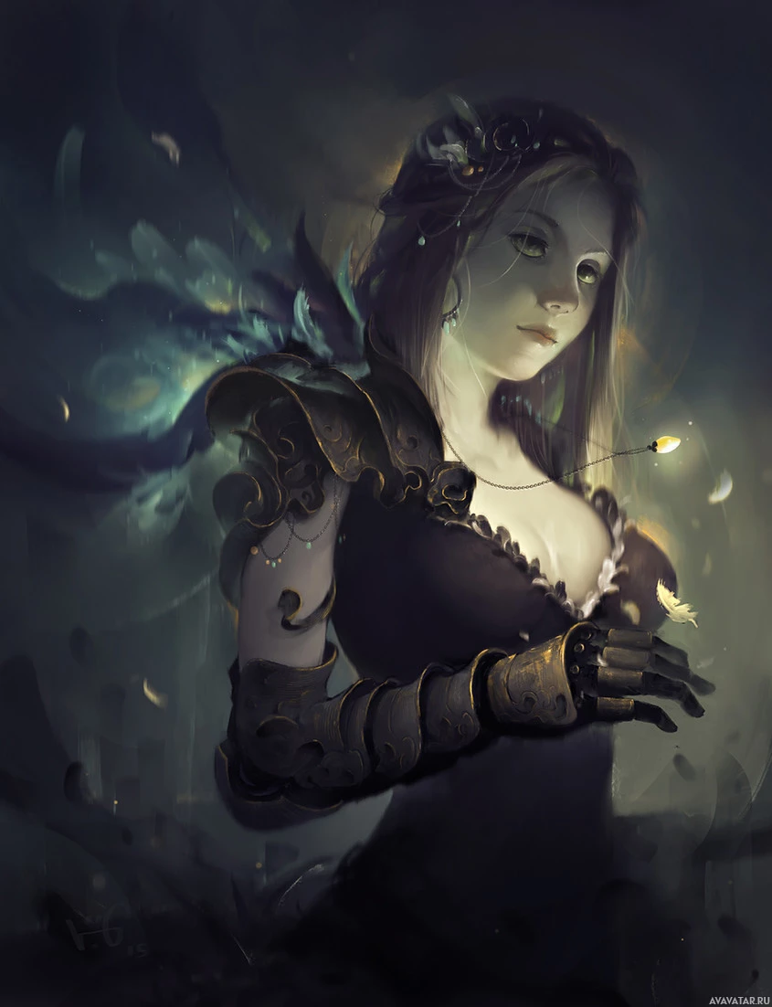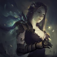 a young woman with long hair and what appears to be magical or otherworldly features. She is wearing a dark dress adorned with