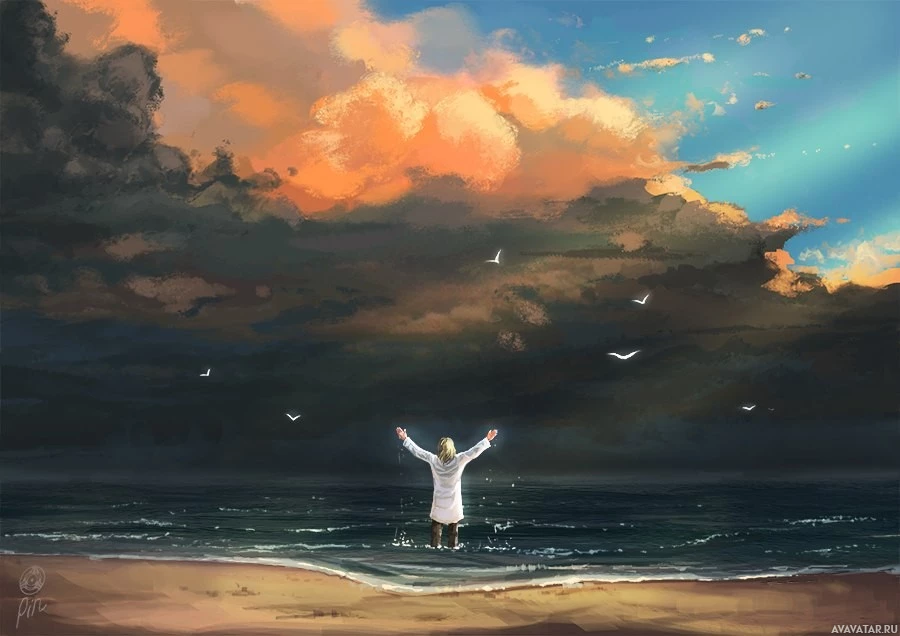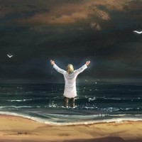 shallow water on what appears to be a beach. The individual seems to be looking out towards the ocean or sea, with one arm raised as if they are waving goodbye or signaling someone or something not visible in the picture. Behind them, the sky is dramatic, filled with large,