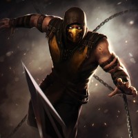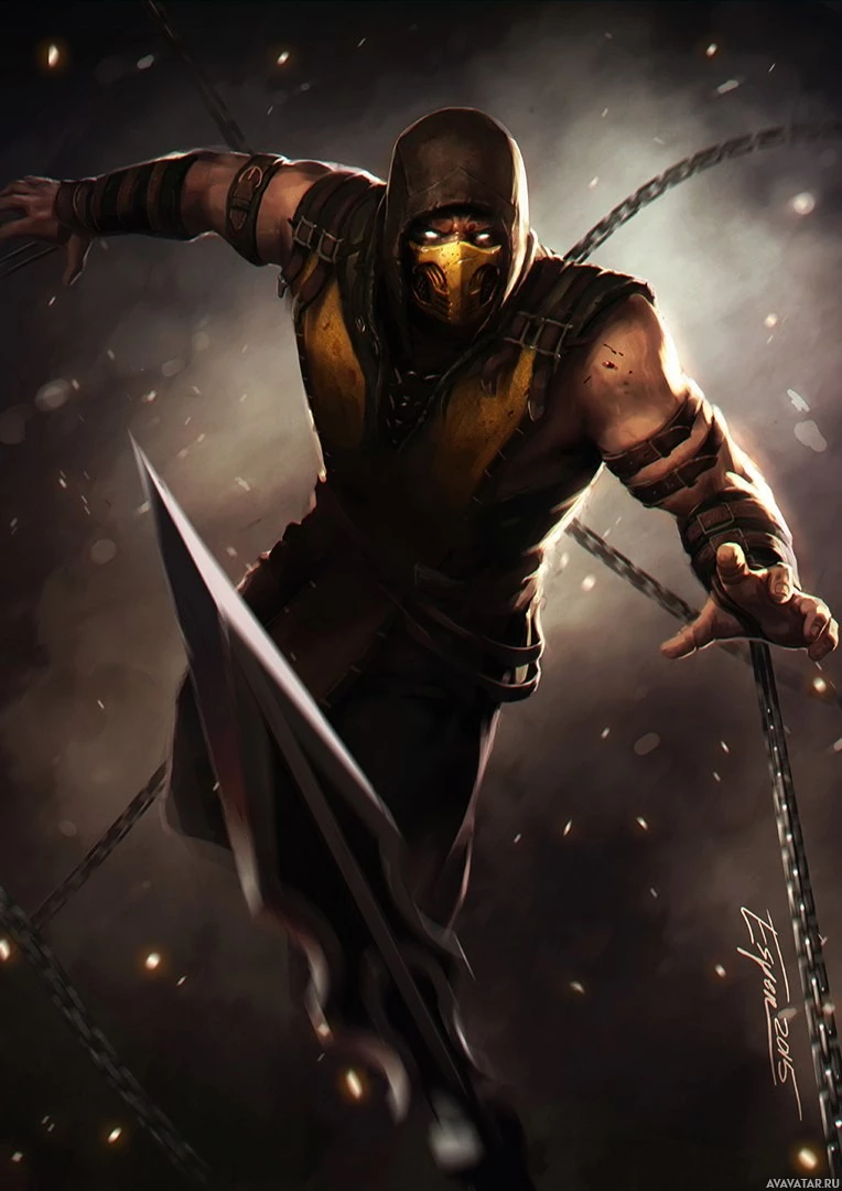 The image depicts a character known as Scorpion from the Mortal Kombat video