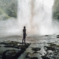 The image shows a person standing in front of a waterfall. The individual appears as a silhouette against the bright,