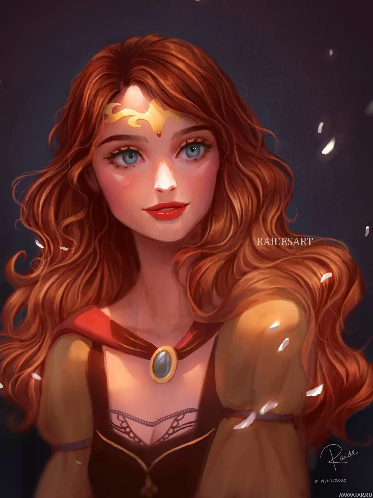 a young woman with red hair. She appears to be in a fantasy or