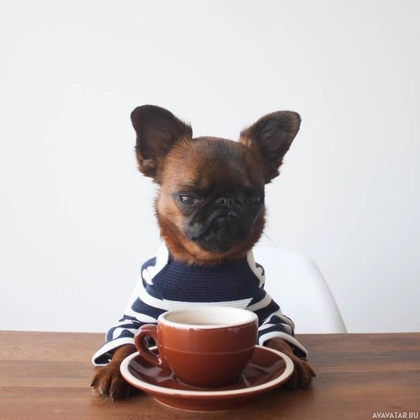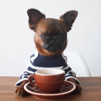 a small dog, possibly a Pug or a Chihuahua, sitting at a table with two coffee cups. The dog is dressed in a black and white