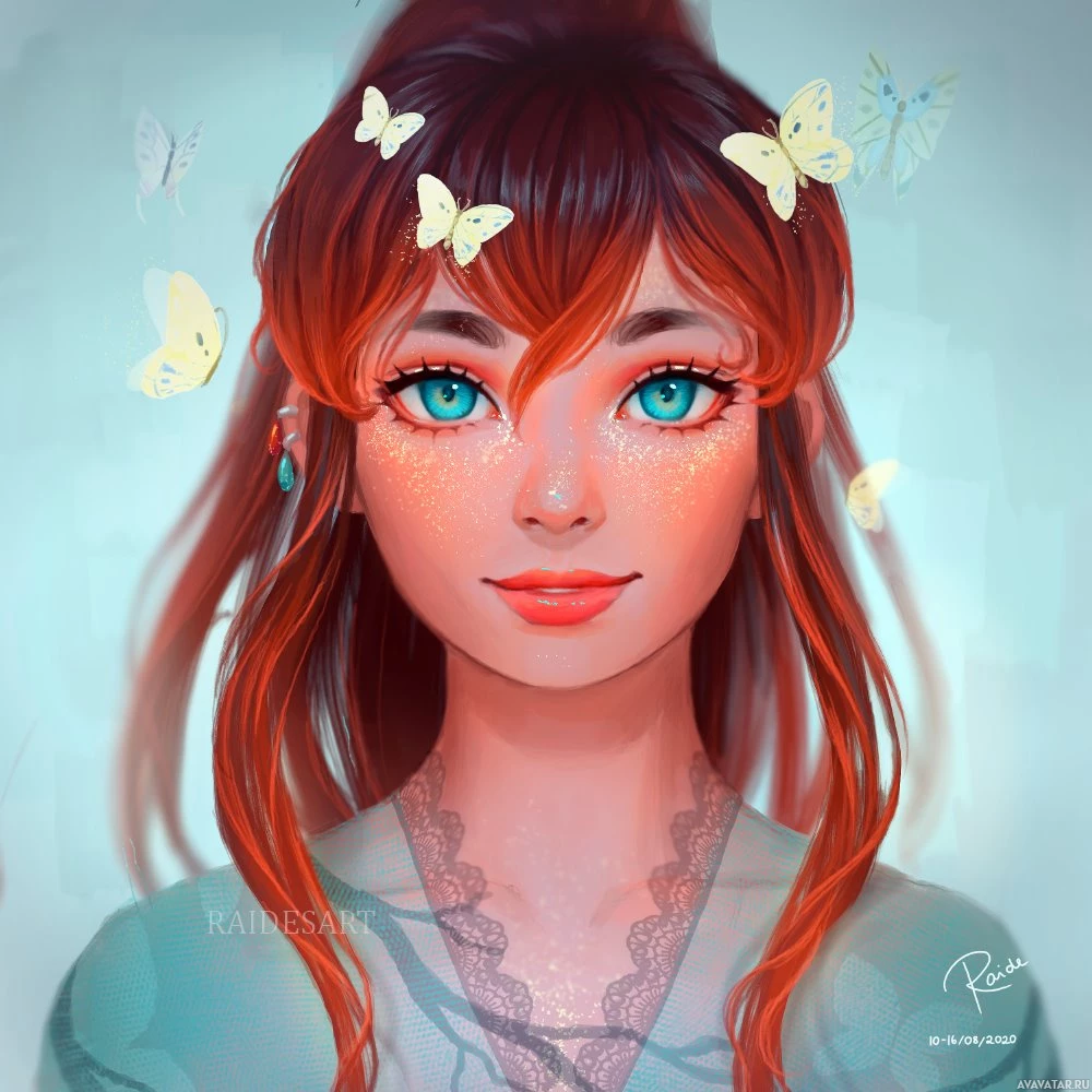 blue eyes and a cheerful expression, smiling at the viewer. Above her head are several butterflies fluttering around, adding to