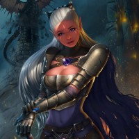 female warrior with long blonde hair and blue eyes. She is wearing armor and holding what appears to be a shield or