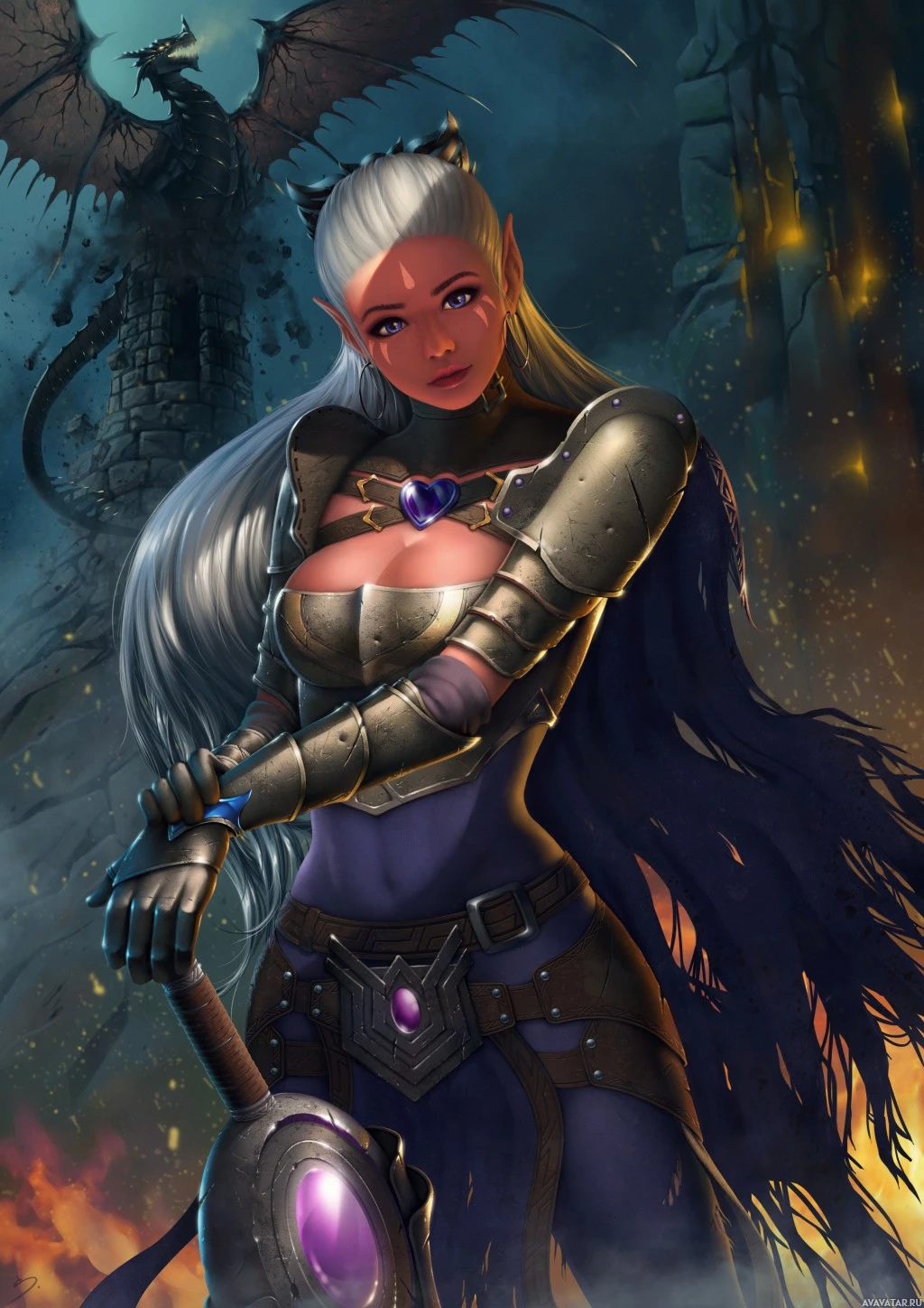 a piece of armor in her right hand. Her expression is serious, and she stands against a dramatic backdrop that includes ruins and flames, suggesting a scene from