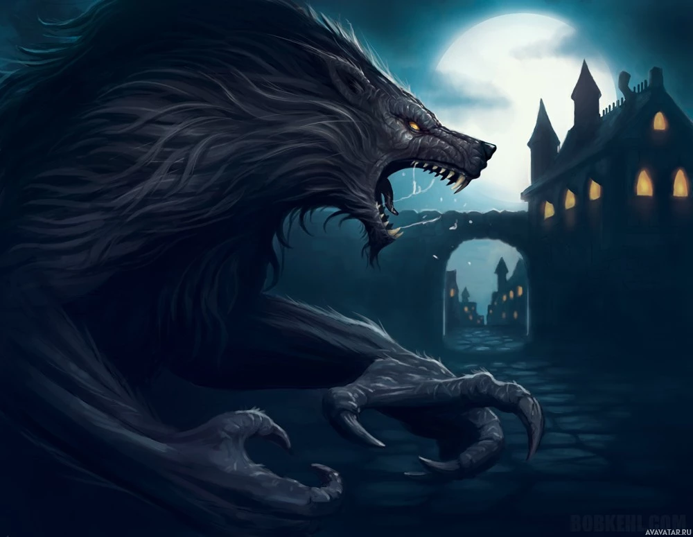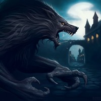 a fantasy scene with a werewolf as the central figure. The werewolf is shown in a dynamic and intense pose, with its fur looking thick and menacing. It appears to be howling or yelping, possibly indicating aggression or distress. In the background, there's a gothic-style structure that resembles a castle, silhouetted against
