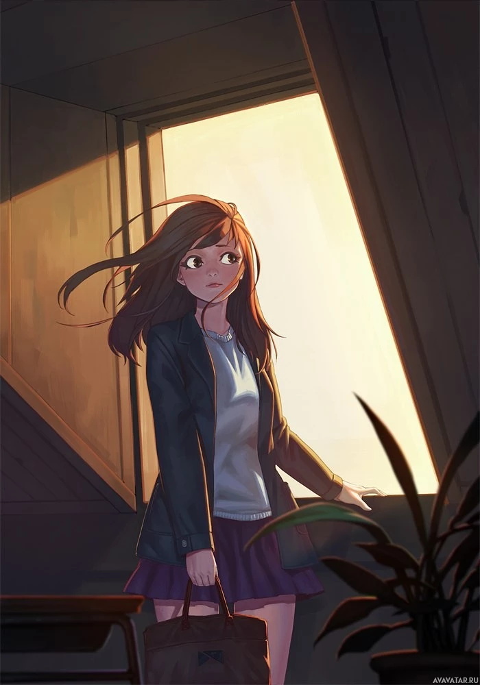 a white top and has a handbag with her. The setting seems to be indoors at sunset or during a calm evening, as suggested by