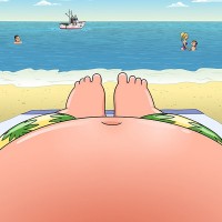 a boat sailing in the distance, suggesting a relaxed, vacation-like setting. The character appears to be wearing swim trunks or board shorts that are decorated with