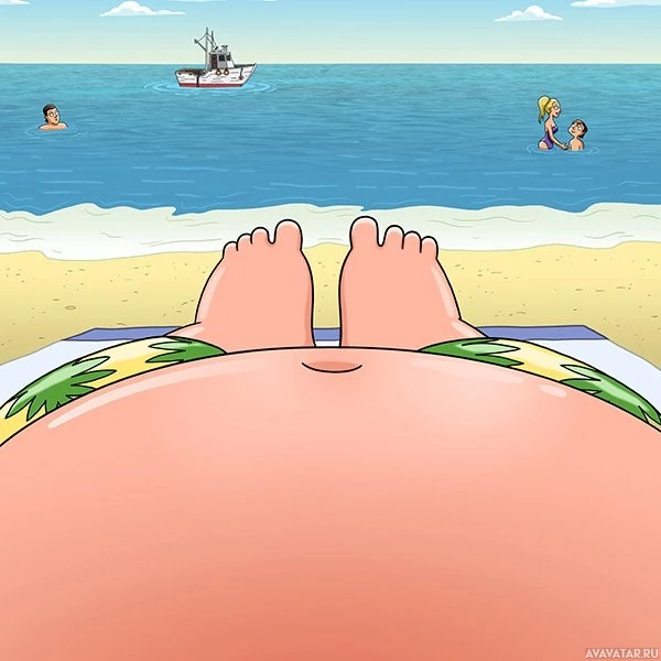 an animated character lying on a beach with sand and water visible in the background. There is also