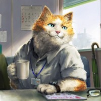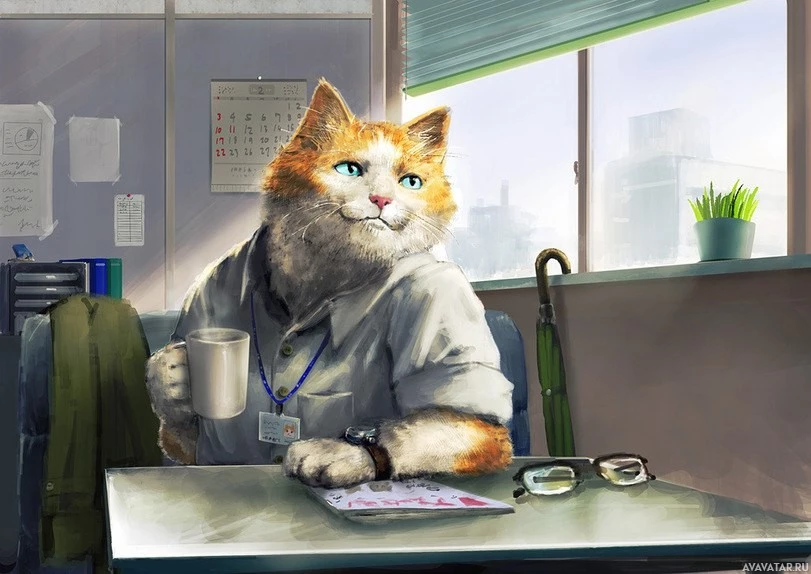 a coffee mug, a computer monitor, a lamp, and documents on the desk. The cat is holding a pen and seems to be engaged in work or perhaps taking a break with a sip from its cup. This artwork combines human elements with animal features, creating an amusing and whimsical scene.