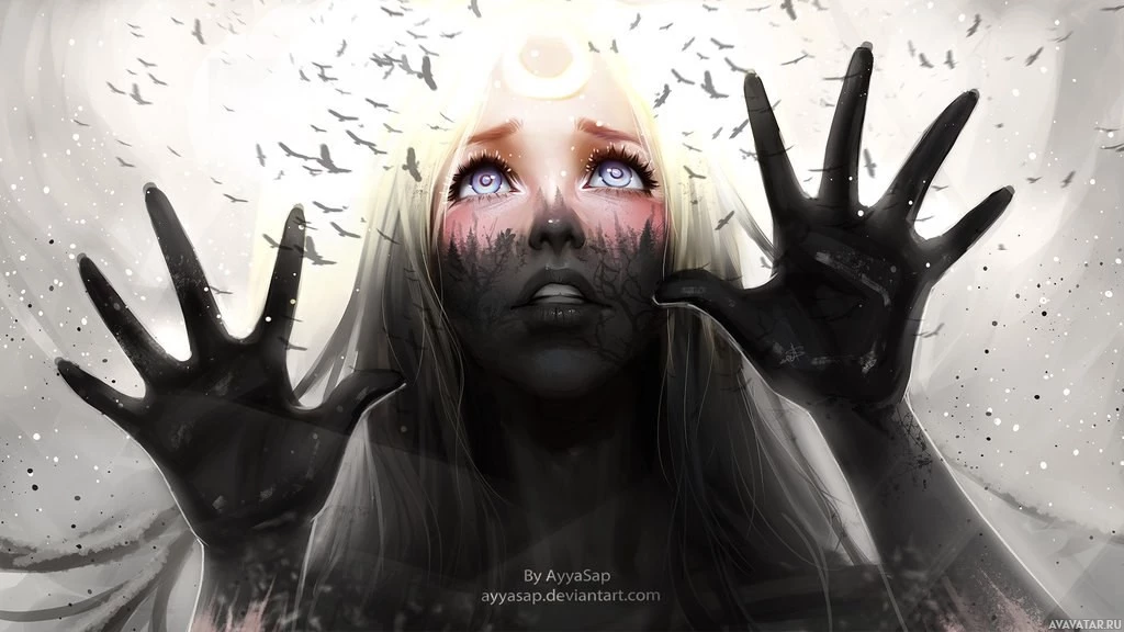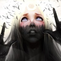 a dramatic sky filled with dark clouds, which contrasts with the bright light emanating from her hands. The art style suggests it could be related to anime or fantasy genres.