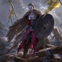 a female warrior, likely depicted as a character from a fantasy story or game. She is holding
