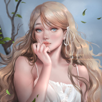 a contemplative expression, her hand resting on her chin as if she's deep in thought. She is wearing a white off-the-shoulder top or dress that gives the impression of