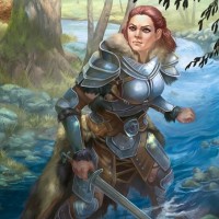 a female character, possibly from a fantasy or historical setting. She is wearing armor and carrying a sword, suggesting she might be a warrior or a knight. She has