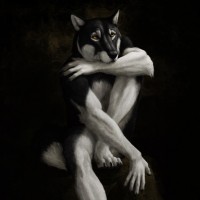 sharp teeth that are visible, indicating its transformation into a wolf-like creature. The style of the artwork is realistic with attention to detail in