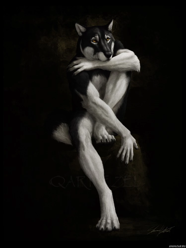 human form. The character is seated on one knee, leaning against the other with arms crossed and hands resting on the thighs. It has long claws and