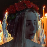 chest area, suggesting that she might be depicted in a vampire or gothic context. Behind her is an arrangement of candles, contributing to