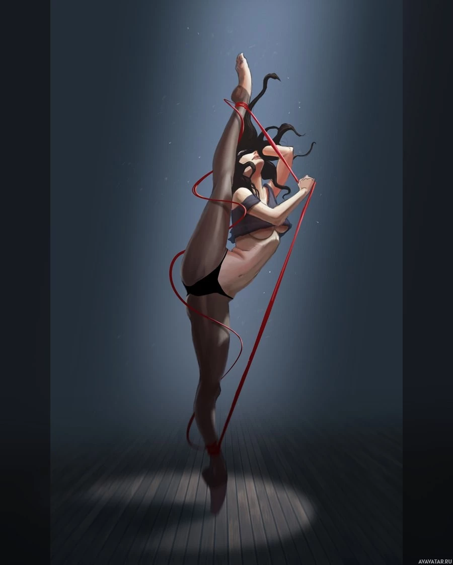 black pants and red ribbons that appear to be tied around their thighs, possibly indicating a costume or part of the performance. The setting looks like an indoor