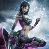 The image depicts a character with features resembling X-23 from the X-Men comics. She is shown in a dynamic pose, possibly in combat attire, and there's a sense of motion suggested by her stance and the positioning of the character relative to the robotic elements in the background.