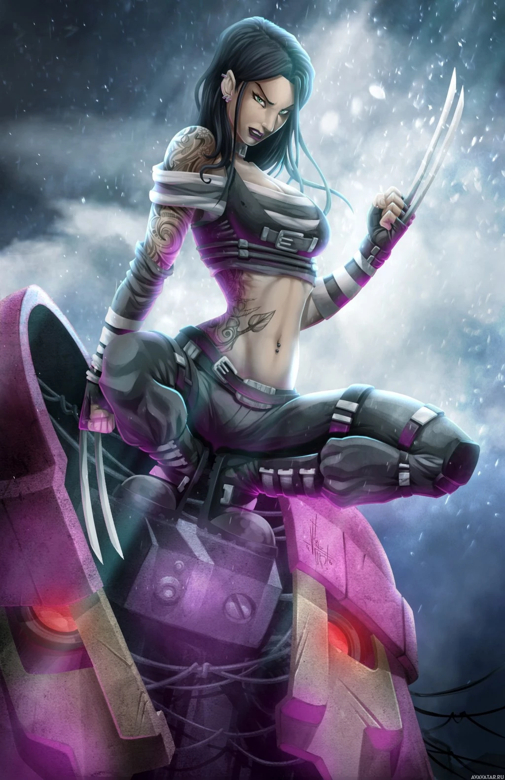 На картинке изображен персонаж с чертами, напоминающими X-23 из комиксов о Людях Икс. Она показана в динамической позе, возможно, в боевой одежде, и есть ощущение движения, предлагаемое ее позицией и расположением персонажа относительно роботизированных элементов на заднем плане.