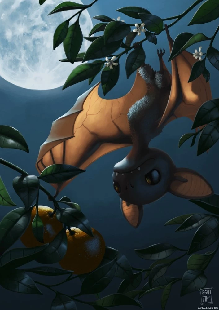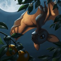 animated scene with a bat-like creature flying through a fruit tree. It appears to be an artistic representation rather than a real photograph. The bat-like creature has