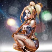 Harley Quinn. She is depicted in her signature costume, which includes a black and white outfit with red accents, as well as her iconic