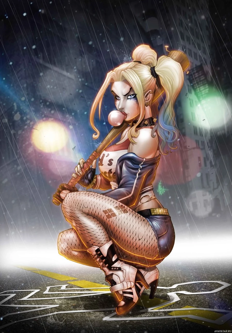 a rainy night, given the wet road and the ambient lighting that suggests rain. The image is stylized and artistic, showcasing the character's playful and unconventional persona that she is known for in