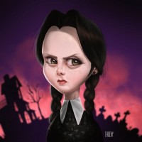 На картинке изображен анимированный персонаж, который выглядит как ребенок с черными волосами в двух косичках, одетый в черный наряд с белой детализацией кружев и аксессуарами. Фон предполагает жуткую тему Хэллоуина с силуэтами домов и надгробий под темным небом. Выражение лица персонажа суровое и несколько недовольное.