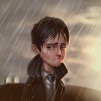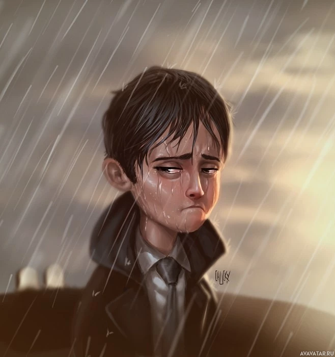 an animated character, a young boy with dark hair and a somewhat distressed or sad expression. He is dressed in what appears to be
