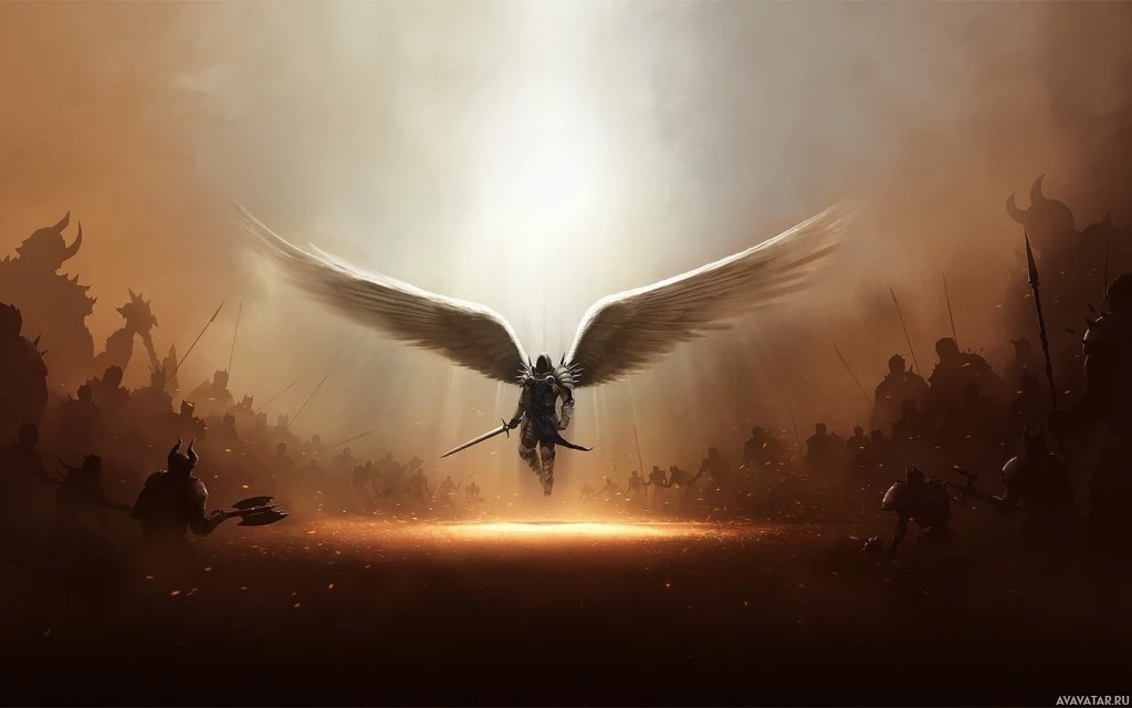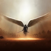 the dramatic scene depicted in the image. The angel-like wings on the character may indicate some