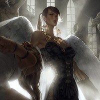 a fantasy scene featuring an angelic figure prominently in the center. This character stands with her wings partially spread, emanating