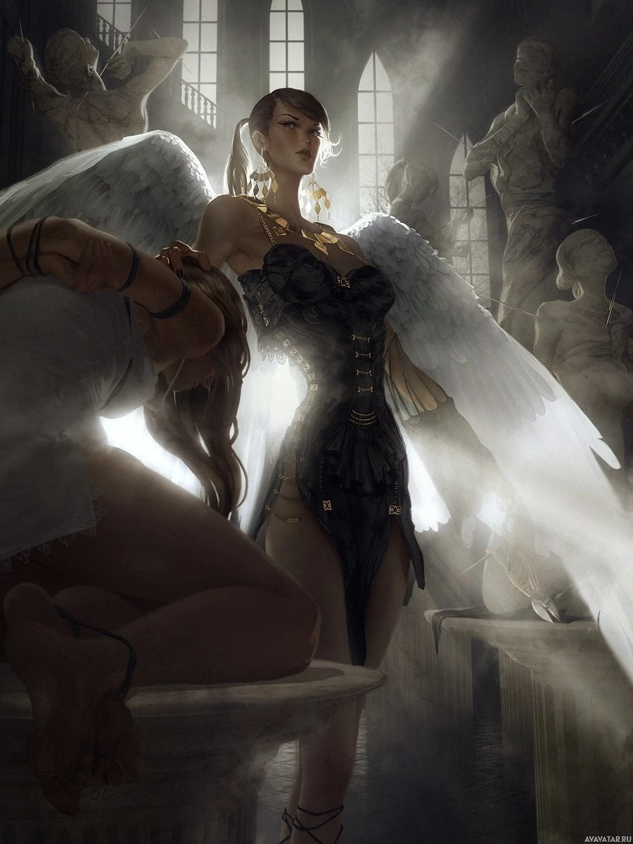 a sense of desperation or need. The background reveals an ancient setting with classical statues and architectural features that could be part of a temple or a place of historical significance. The atmosphere is dramatic and filled with tension, as the angel's presence seems to dominate the space. The lighting is uneven, with areas of intense illumination highlighting certain parts of the scene, while other areas remain shadowy. Overall, the image captures a moment where the angelic figure could be a deity or powerful entity interacting with someone in need, set against an ancient and mysterious backdrop that adds to the fantastical and dramatic tone of the scene.