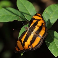 The image shows a butterfly perched on what appears to be a leaf. The butterfly has wings with a pattern that is characteristic of the Lacewing genus, which includes species known for their colorful