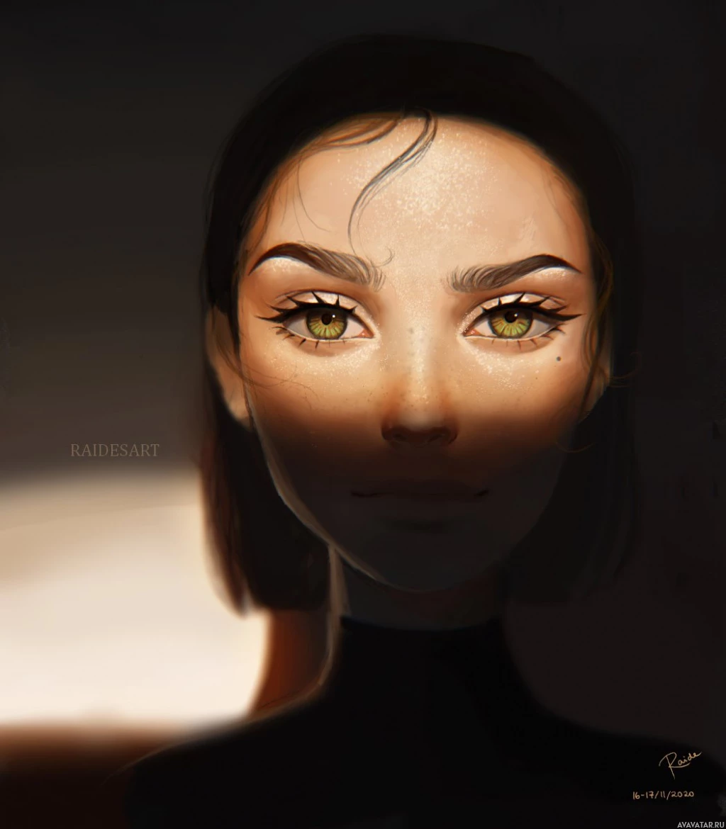 green eyes and is wearing what appears to be a black top. The artwork uses shading and highlights to give the character a three-dimensional appearance, despite being a drawing. Her expression is contemplative, and she seems to be looking slightly away from the viewer.