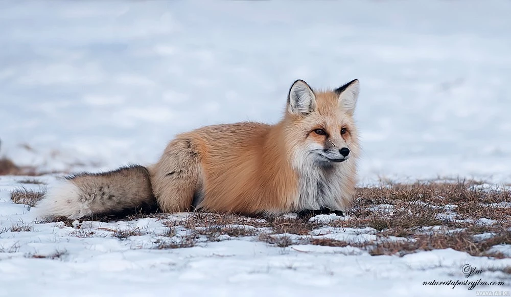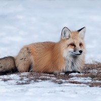 a red fox lying on the ground in what appears to be a snowy environment. The fox has distinctive reddish-
