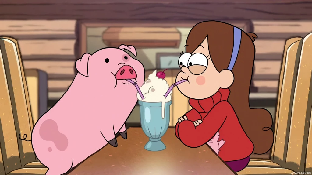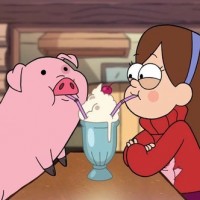 the animated movie "Gravity Falls," and a character that resembles Pig, also known as "Pig" from the same series. They are seated at an outdoor dining table, with Mabel holding a spoonful of