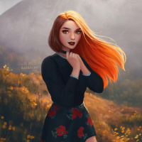 a black top with floral patterns on it. Her posture suggests she might be posing for the portrait. The background features a landscape that could be described as mountainous or hilly, with some patches of grass and what appear to be