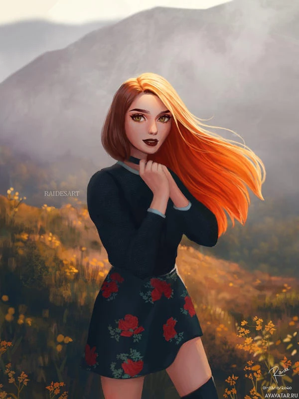 red hair, who appears to be standing in a natural setting. She has rosy cheeks and is wearing