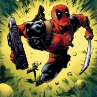 yellow hues. In front of Deadpool, there's another character who appears to be running towards him, though it's not clear from this image what their relationship might be or the context of their encounter. The background shows a space setting with planets and stars. There is no text visible in this image.