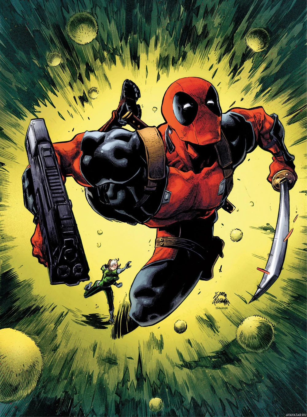 book cover featuring the character Deadpool. He is in the center, holding