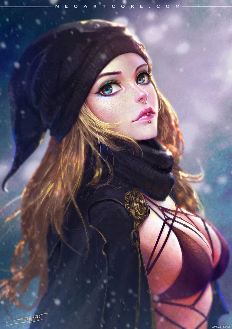 an enchanting expression on her face. The background suggests a wintry atmosphere with snow falling, which adds to the magical,