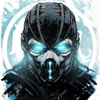 The image shows an illustration of a character from the video game series "Mortal Kombat." This character is known as Sub-Zero, one of the main characters in the franchise. He is depicted with his iconic blue and black outfit, and he's wearing a helmet with glowing eyes. The background has a metallic sheen and features the game's logo.