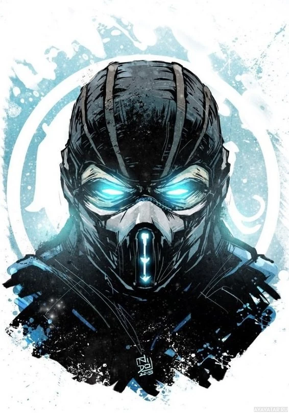 На картинке показана иллюстрация персонажа из серии видеоигр «Смертельная битва». Этот персонаж известен как Суб-Зиро, один из главных персонажей франшизы. Он изображен со своим знаковым синим и черным нарядом, и он носит шлем со светящимися глазами. Фон имеет металлический блеск и имеет логотип игры.