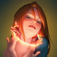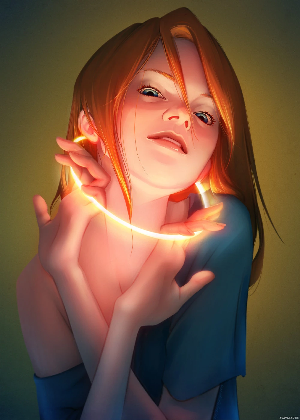 a female character with red hair. She appears to be gazing off to the side, and there is a glowing halo-like light around her neck. The character has