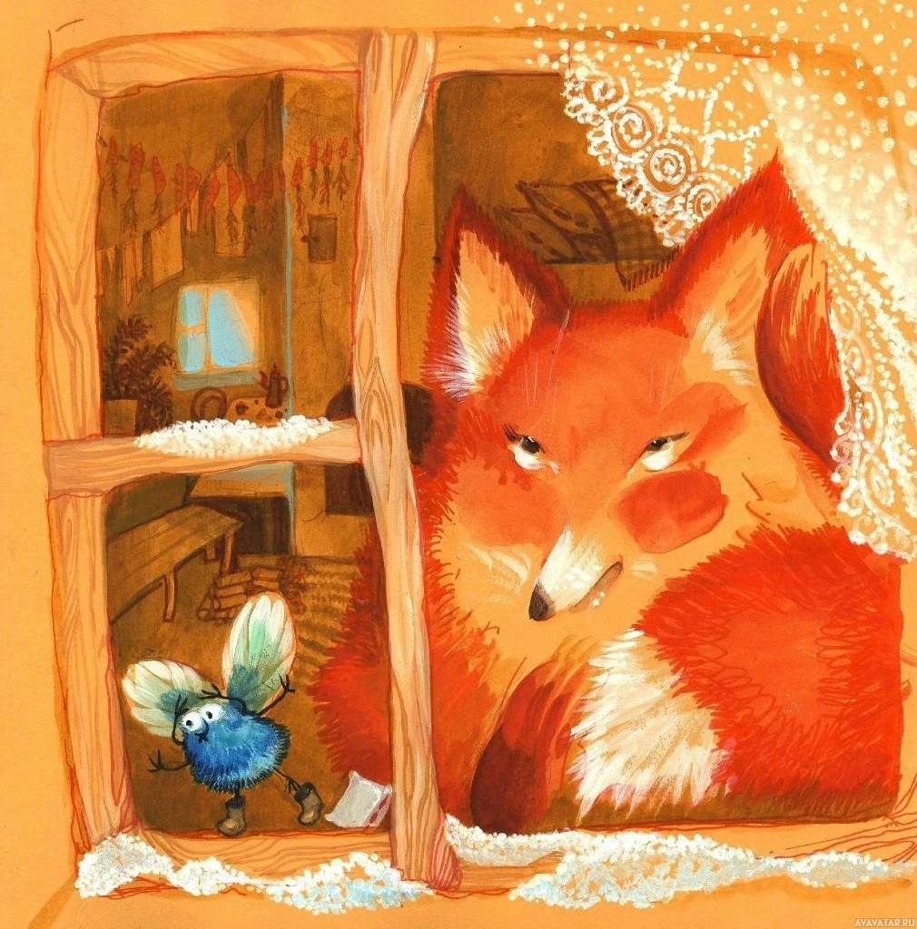 outdoor life, perhaps during winter when animals might seek warmth from buildings. The colors are vibrant, with red tones dominating the image for the fox and green for the window frame.