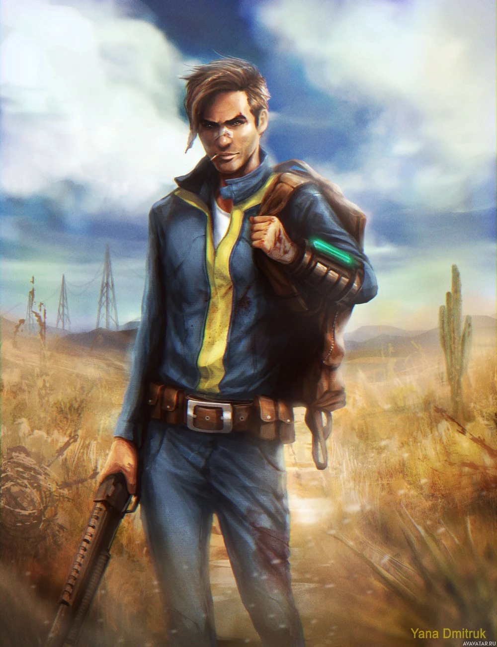 Vault Dweller armor and is holding a gun in his right hand, while a backpack is slung over his shoulders. He stands in a desert-like environment with