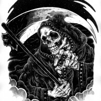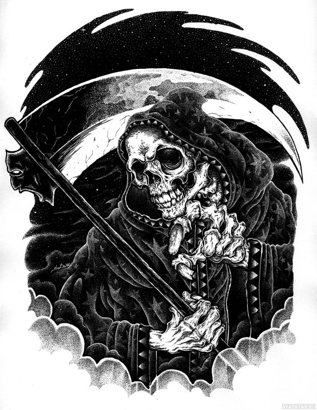 a cloaked figure wielding a scythe, symbolizing harvesting lives. In this artwork, the character is shown in