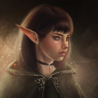 The image depicts a stylized illustration of an elven character, featuring the typical pointed ears and other fantasy elements. She has a neutral expression on her face and is adorned with a cloak that suggests she might be a wizard or mage from a fantasy setting. Her attire and accessories contribute to the overall fantastical theme of the image.