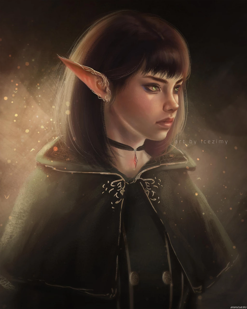 Картинка показывает стилизованную иллюстрацию эльфийского персонажа с типичными остроконечными ушами и другими элементами фэнтези. Она имеет нейтральное выражение на лице и украшена плащом, который предполагает, что она может быть волшебником или магом из фантастической обстановки. Ее одежда и аксессуары способствуют общей фантастической теме образа.